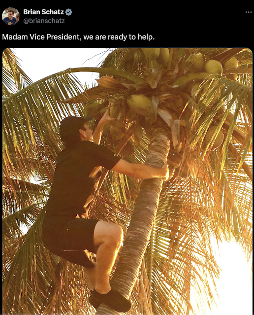 You'll see a lot of coconut tree references, too. A few years ago, Kamala made an off-the-wall comment about a saying her mother was fond of. "You think you just fell out of the coconut tree?" Once mocked for it, now her supporters have embraced it. The brat has collided with the coconut, with the signature font of brat and coconut trees plastered across the internet in the iconic shade of chartreuse.